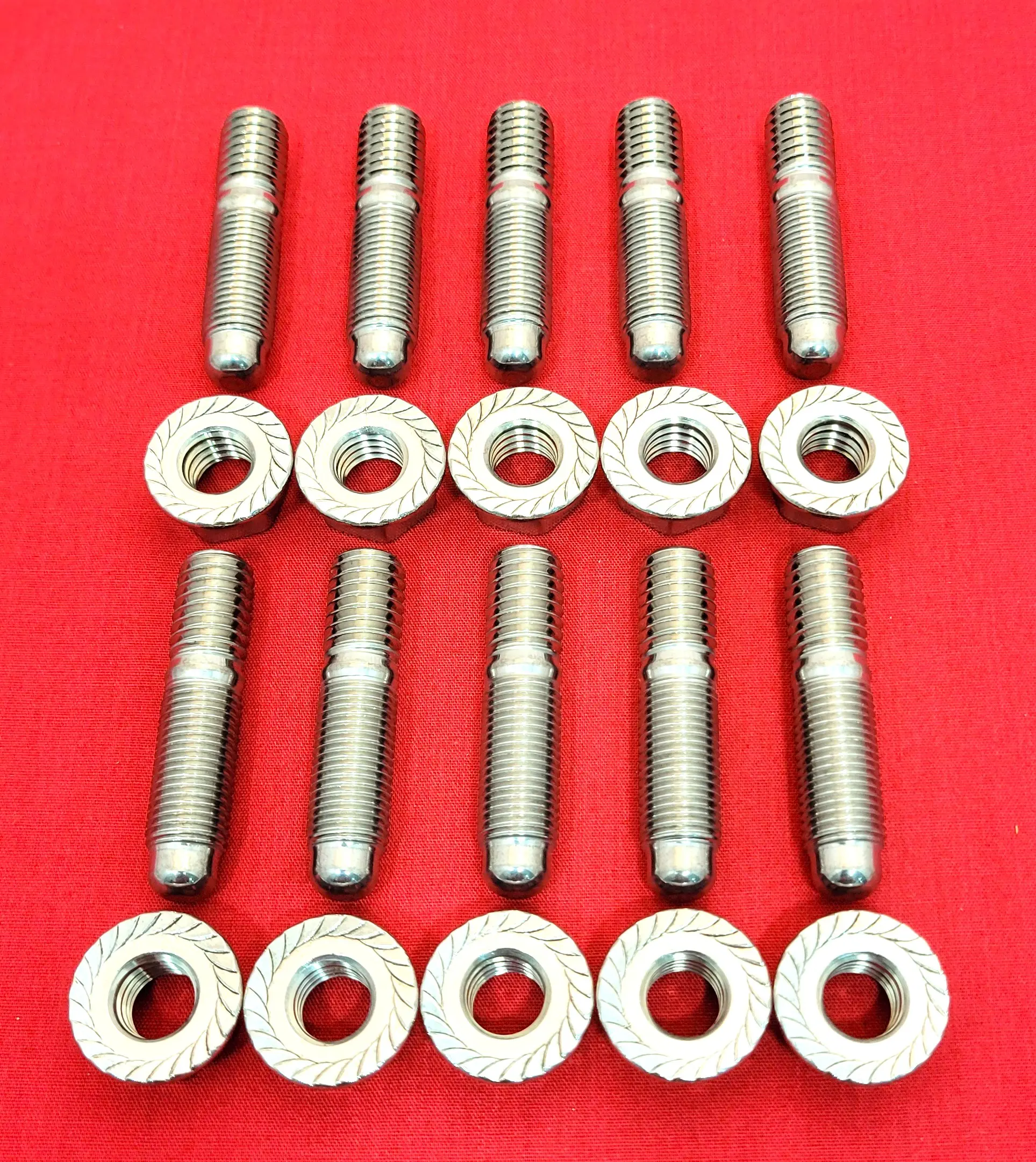 Set of 10 ARP Grade 8 3/8-16/24 Polished Stainless Studs and Flanged Nuts. Studs are rated at 170,000 psi and have a ball lead on them.