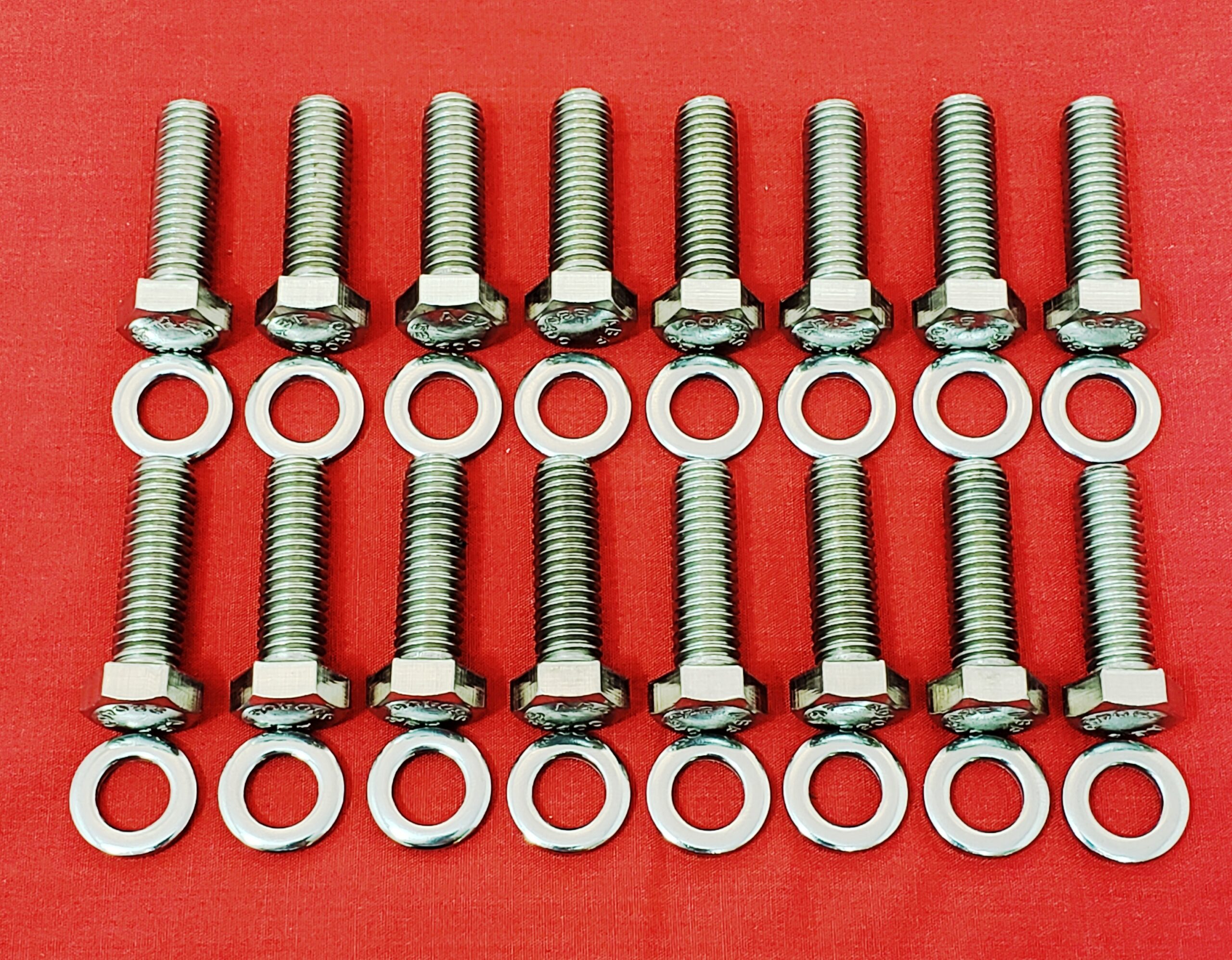 This an exhaust manifold kit for mounting stock manifolds to the heads on your Cadillac V-8 engine. The bolts and extra thick washers are 304 stainless steel and the bolts are 2 1/4 inches long. They are for the engines that use all 3/8 bolts in the heads. Please verify the fit to your engine before ordering. These bolts are not as strong as the stock bolts.