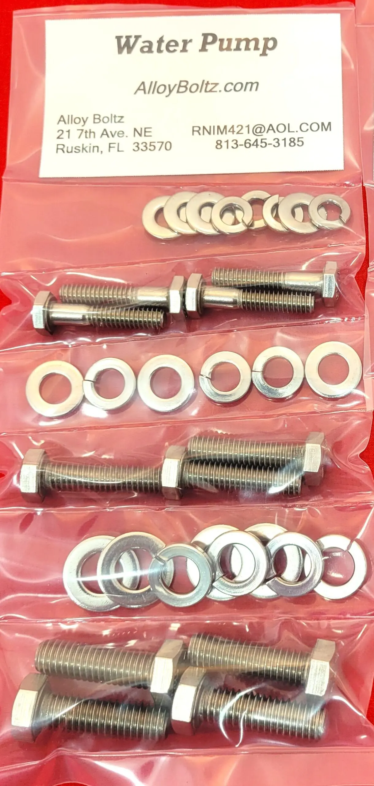 This is a Hex bolt kit for mounting the Water Pump on your Cadillac 472 & 500 V-8 engine. The bolts and washers are 304 stainless steel. Please verify the fit to your engine before ordering.