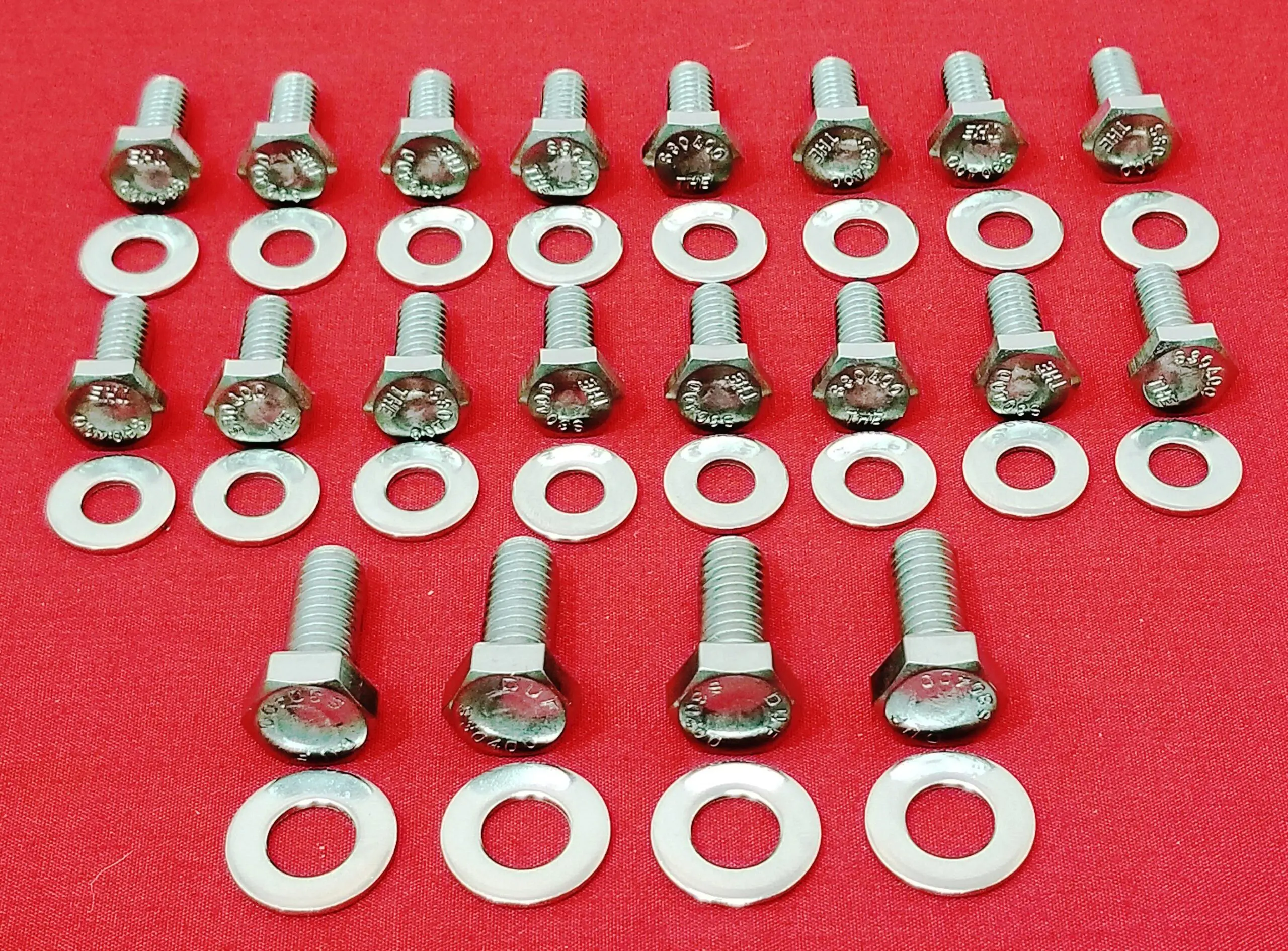 This is a stainless steel stud and nut kit for the Ford 351C, 351M & 400M engines using the a steel or aluminum oil pan. Included in the kit are 20 hex and 20 washers to protect your oil pan. These are great for keeping that pan gasket in place.